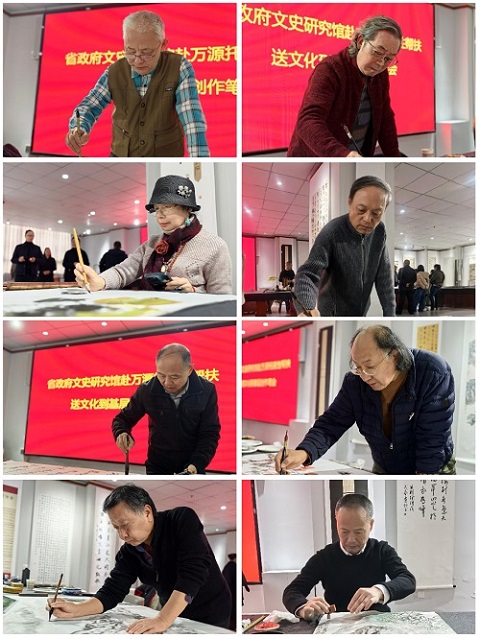 万源文化资源禀赋丰富,此次省政府文史研究馆赴万源开展托底性帮扶工作,重点关注万源特色文化发展之路。在送文化到基层创作笔会上,馆员艺术家们围绕“巴山画屏·红城万源”特色旅游品牌,用笔墨描绘这片红色热土的山川风光与文化底蕴,将八台山、龙潭河、旧院黑鸡、高山蔬菜等自然风光、人文历史和特色产业发展亮点融入书画作品,共创作20余幅作品赠送万源市,用中华优秀传统文化助力万源文化发展。笔会上,艺术家们还为省政府办公厅对口帮扶的鹰背镇蒙学堂村创作书画作品,丰富基层文化生活。